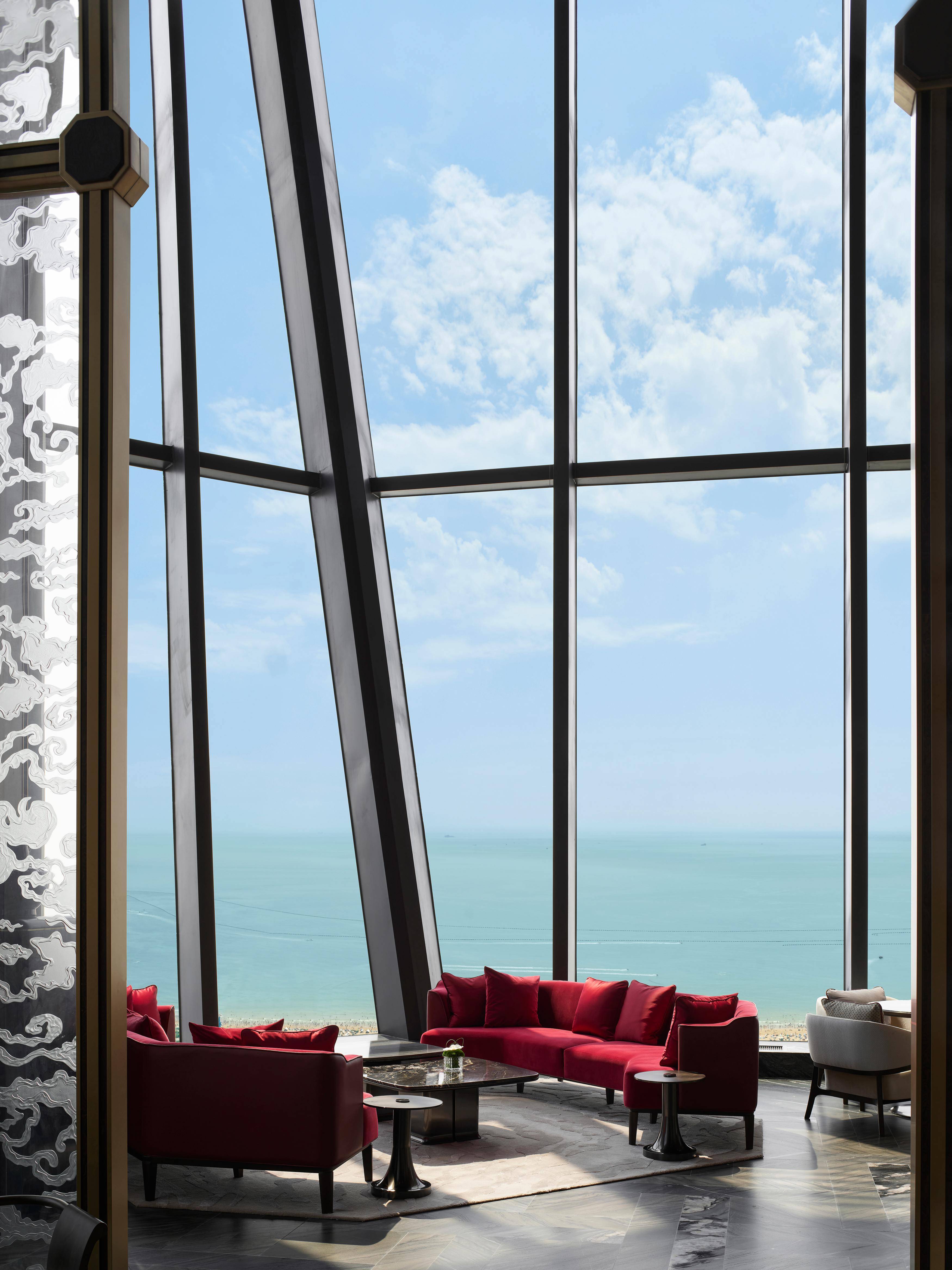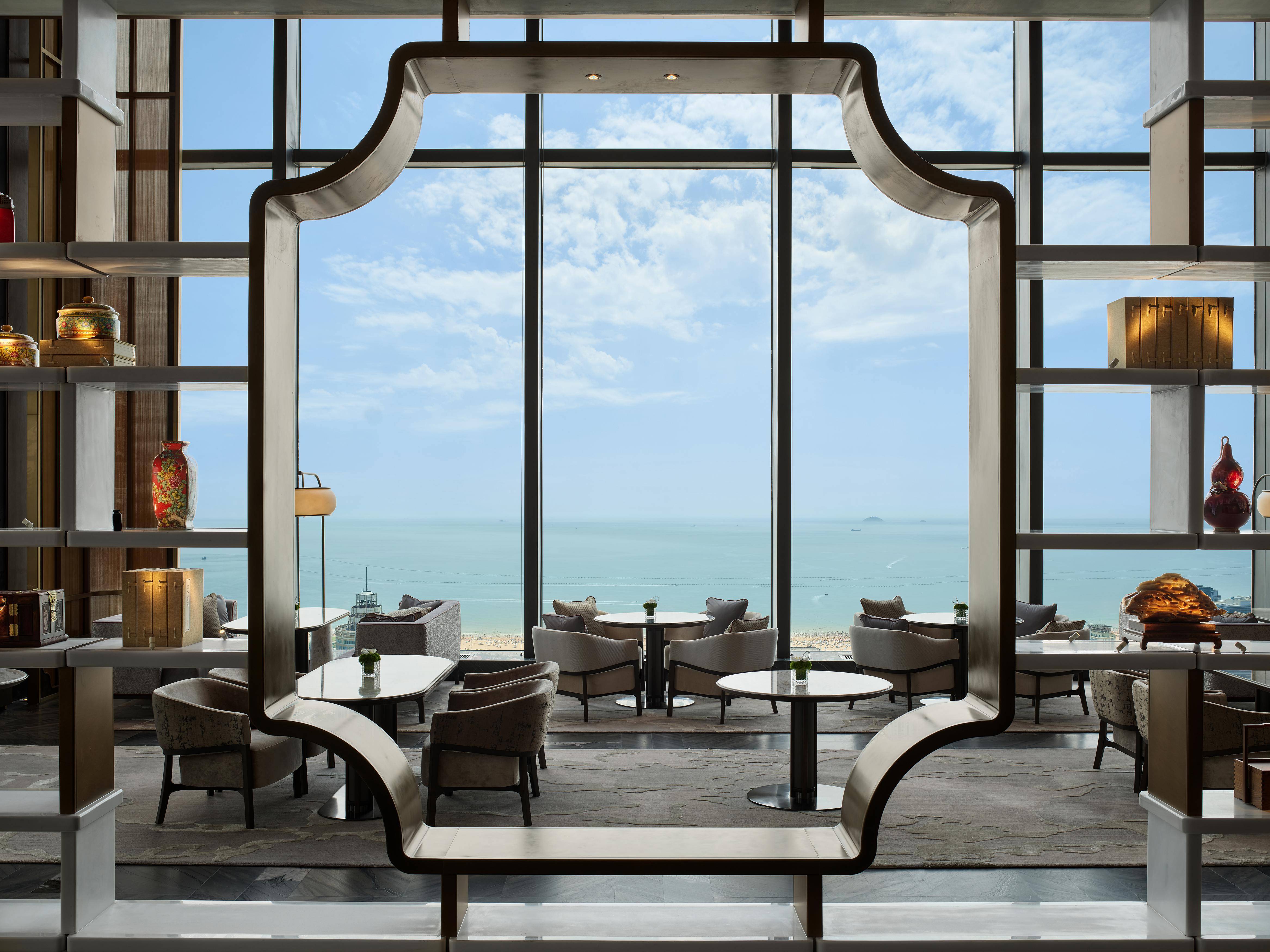 芳菲苑于云端之上呈现从容雅致的尊邸气度,三层挑高的空间以落地窗引入天光与海色,石老人海景尽收眼底;设有可容纳104位宾客的开放式空间及一间12人包间。宝蓝大理石地面与午夜蓝曲线墙面交织出深邃韵致,刺绣白色耐冬花瓣点缀其间,流露东方典雅。