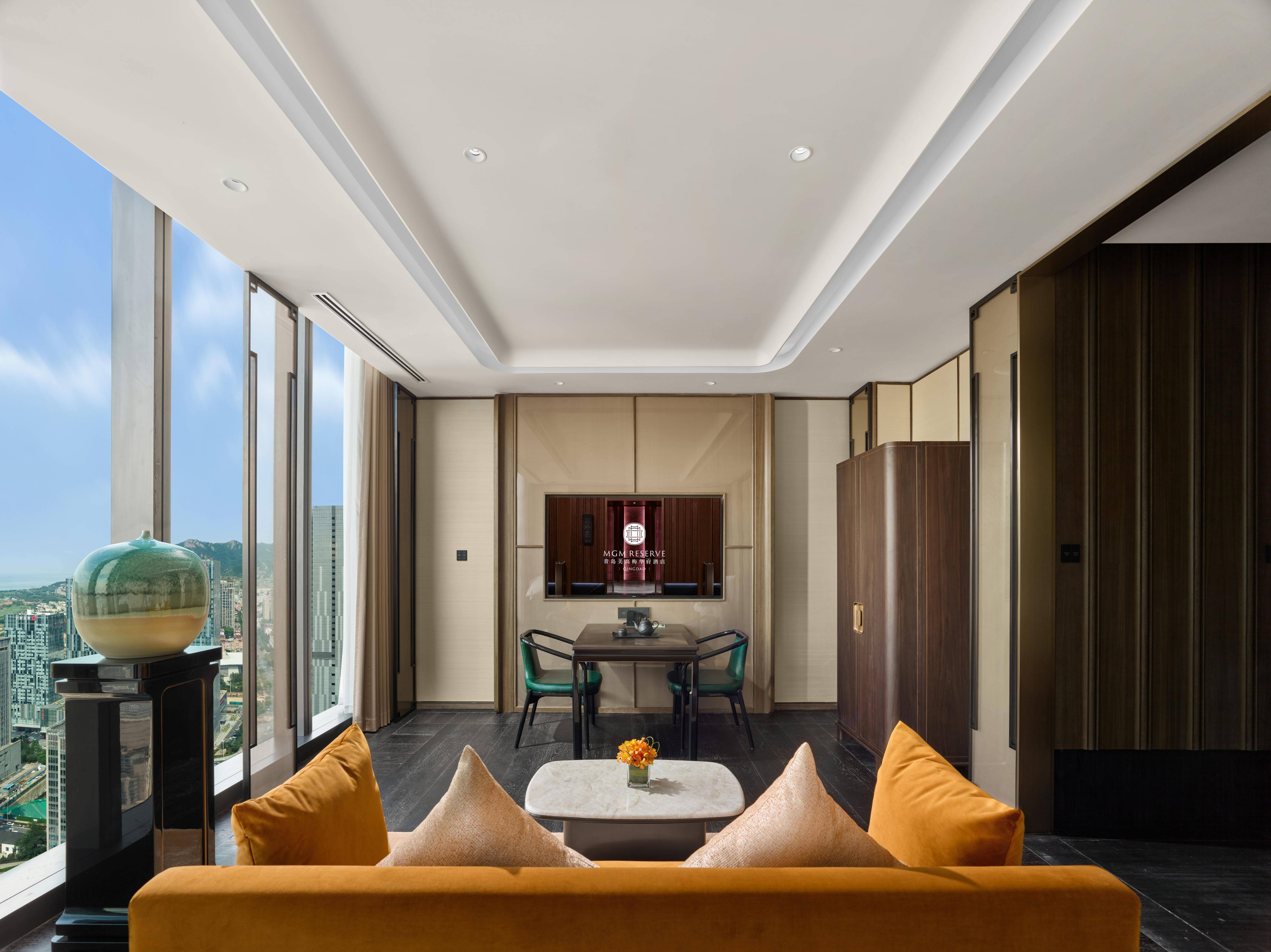 府邸侧海景客房55㎡起,高楼层带来开阔的视野,宾客可在房间的一侧欣赏波光粼粼的一侧海景。室内环境雅致,海洋蓝和中国红两种主题均呈现出尊贵的色彩气韵。墙面装饰的艺术画,书架上陈设着各色瓷器,使整个房间洋溢着浓浓的艺术气息。客房的家具是为酒店专属设计,在提升舒适感的同时,对传统细节提炼和升华由此向中式美学致敬。窗外,是人间烟火气,举目可见城中的万家灯火;室内,是风雅美韵,咫尺可感优雅的中式美学。现代与传统的碰撞,彰显出别致的艺术之境。