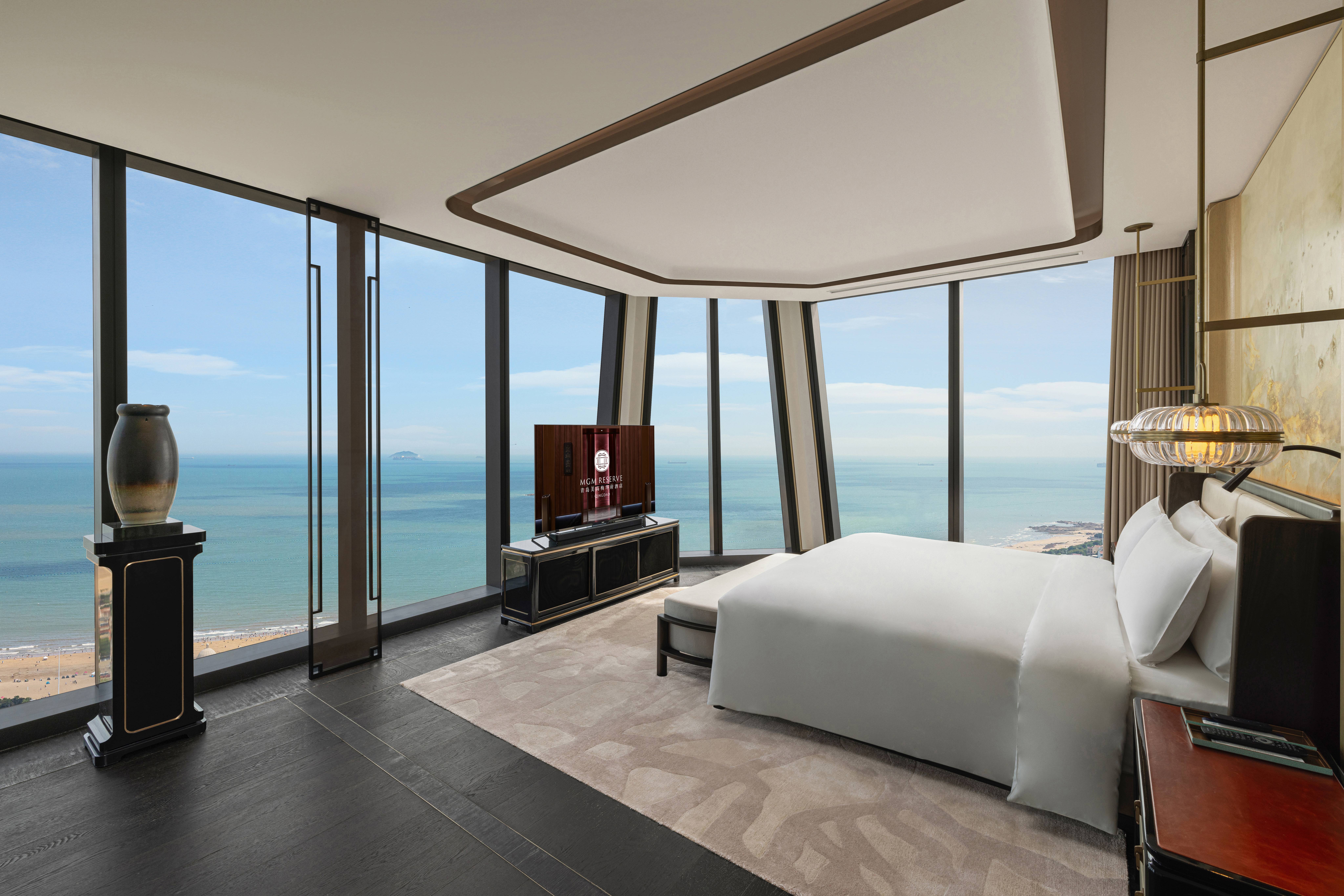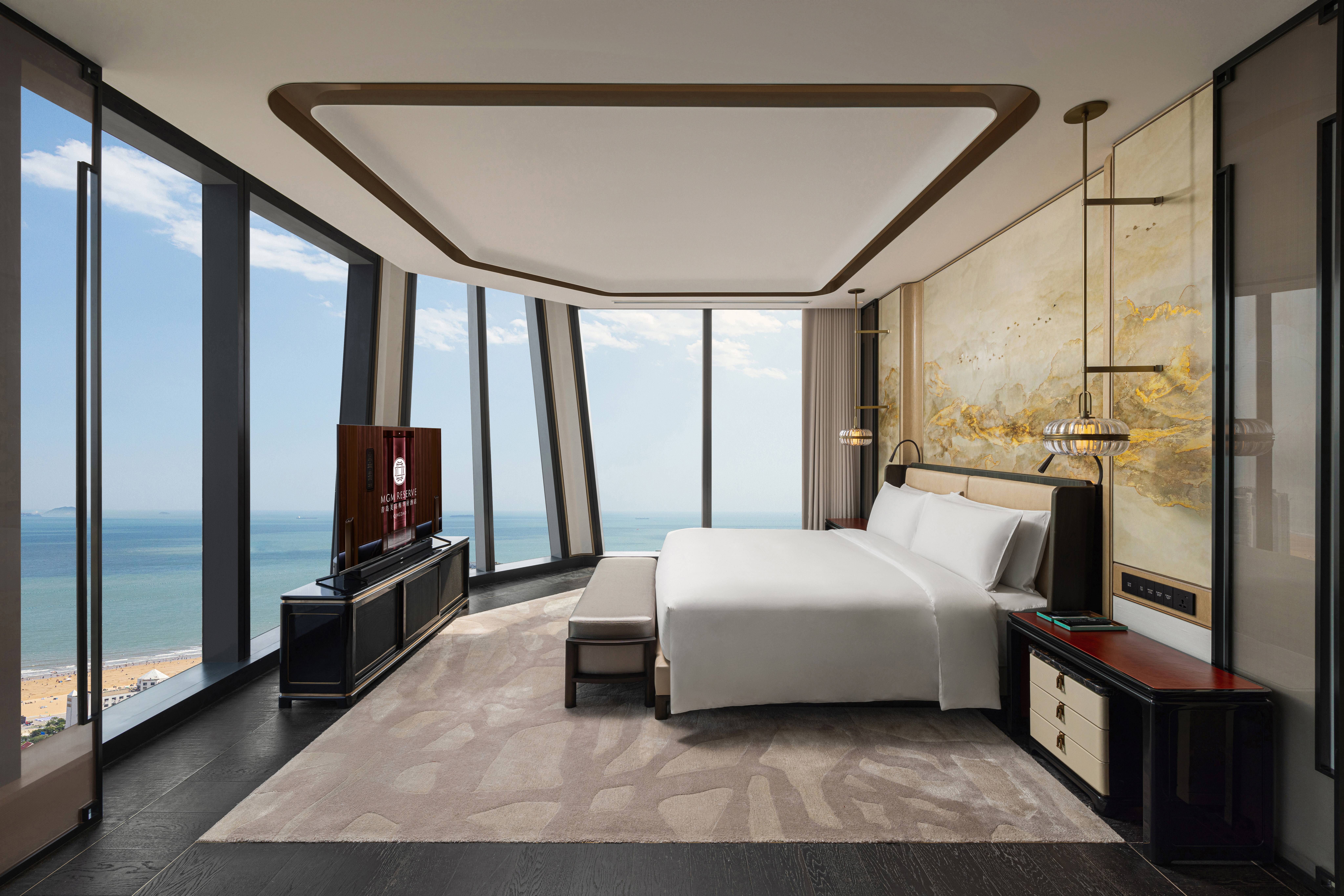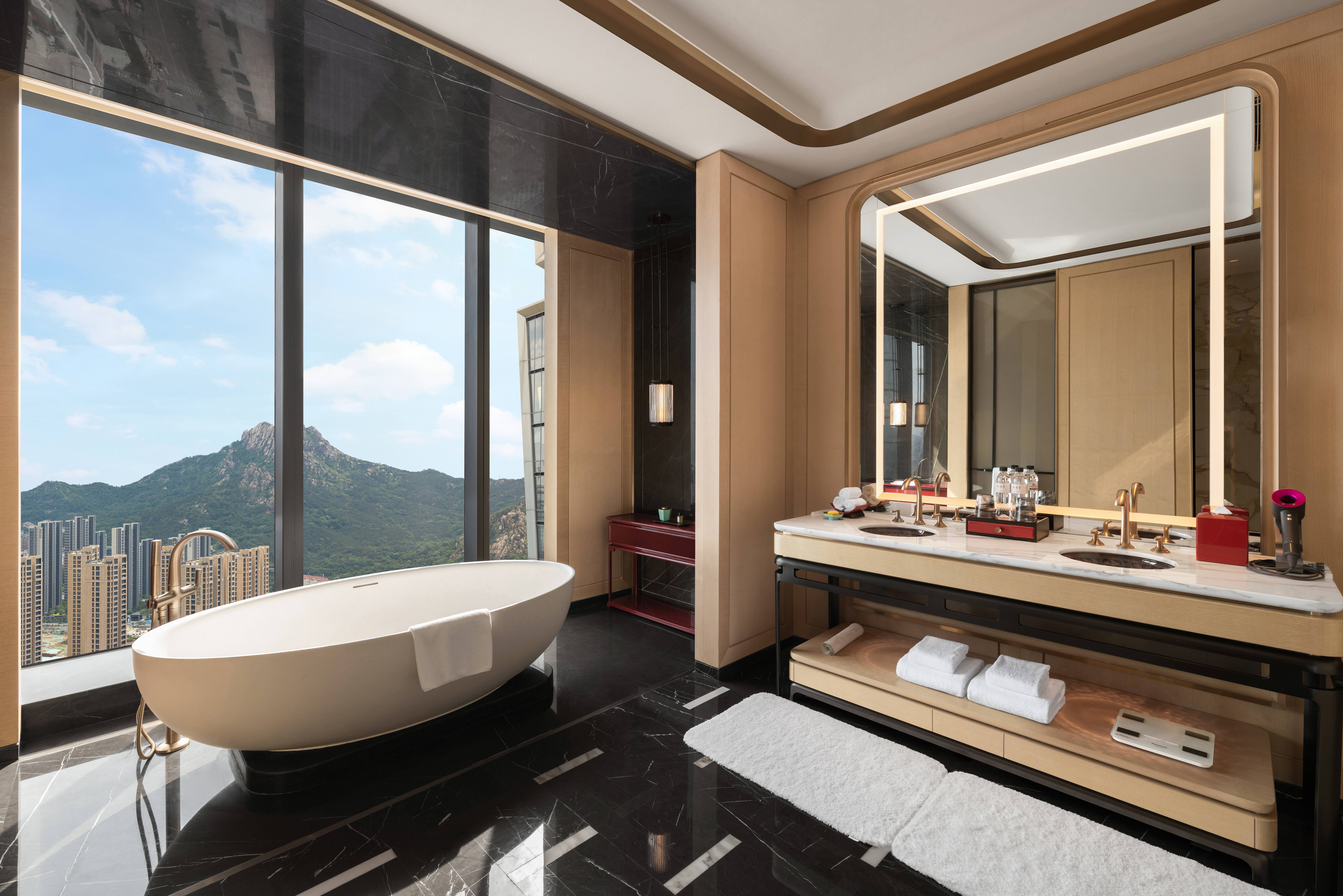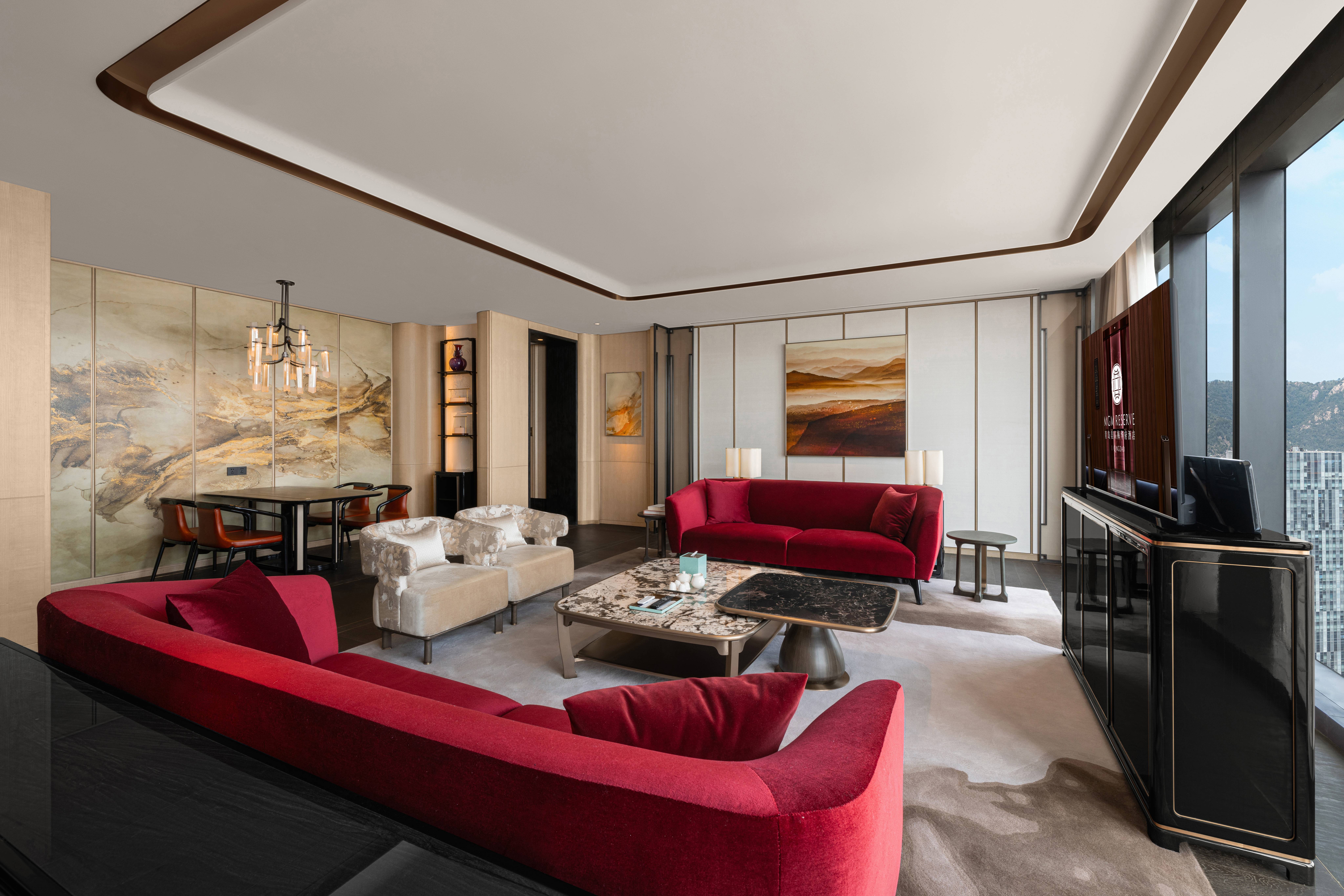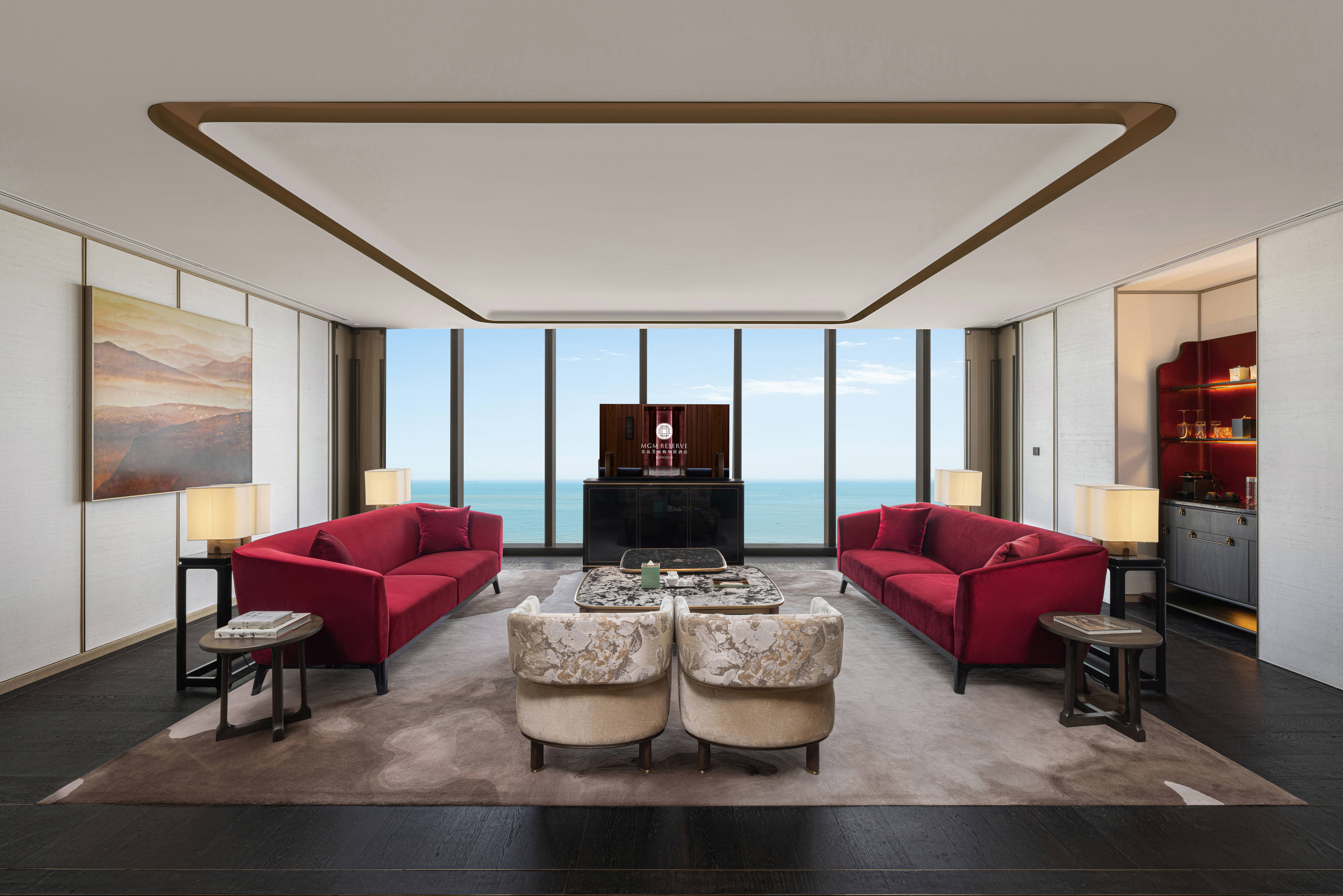 府邸天际海景套房172m²,透过全景落地窗,宾客可以欣赏令人沉醉的石老人海天一色的景观,一步一景,流转在智能空间之内,将生活秩序刻画地淋漓尽致。夕阳金和中国红两大主基色,融汇中国传统于细节,描绘文化格调于器物。亦尊亦雅,栖居在华丽之中,将色彩搭配诠释地尽是风情。青铜材质的线条交错于沉稳的暗色木材中,房间的每一处细节都彰显了优雅生活的艺术性。奢隐与安逸并重,舒适与格调共存。享行政酒廊礼遇。