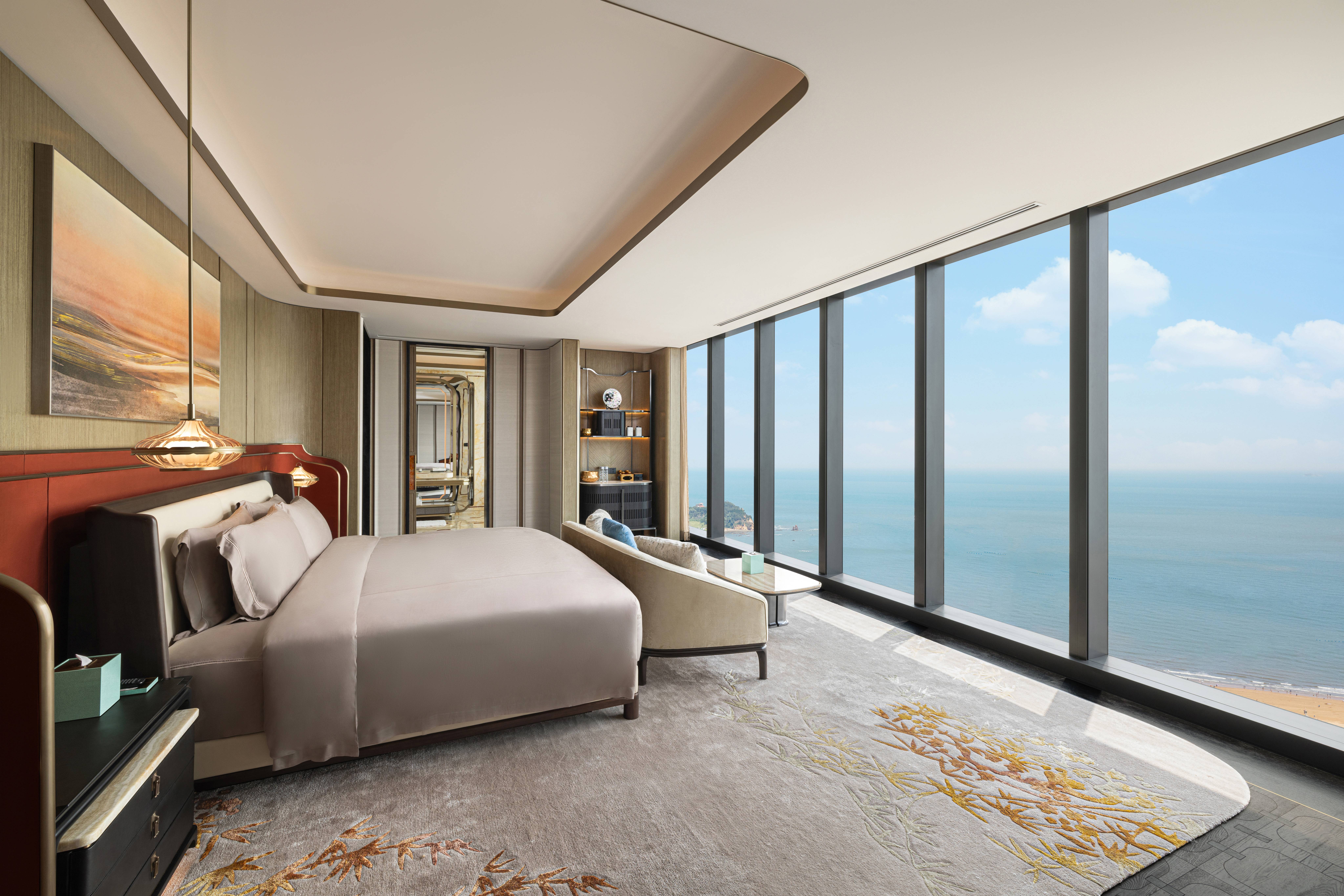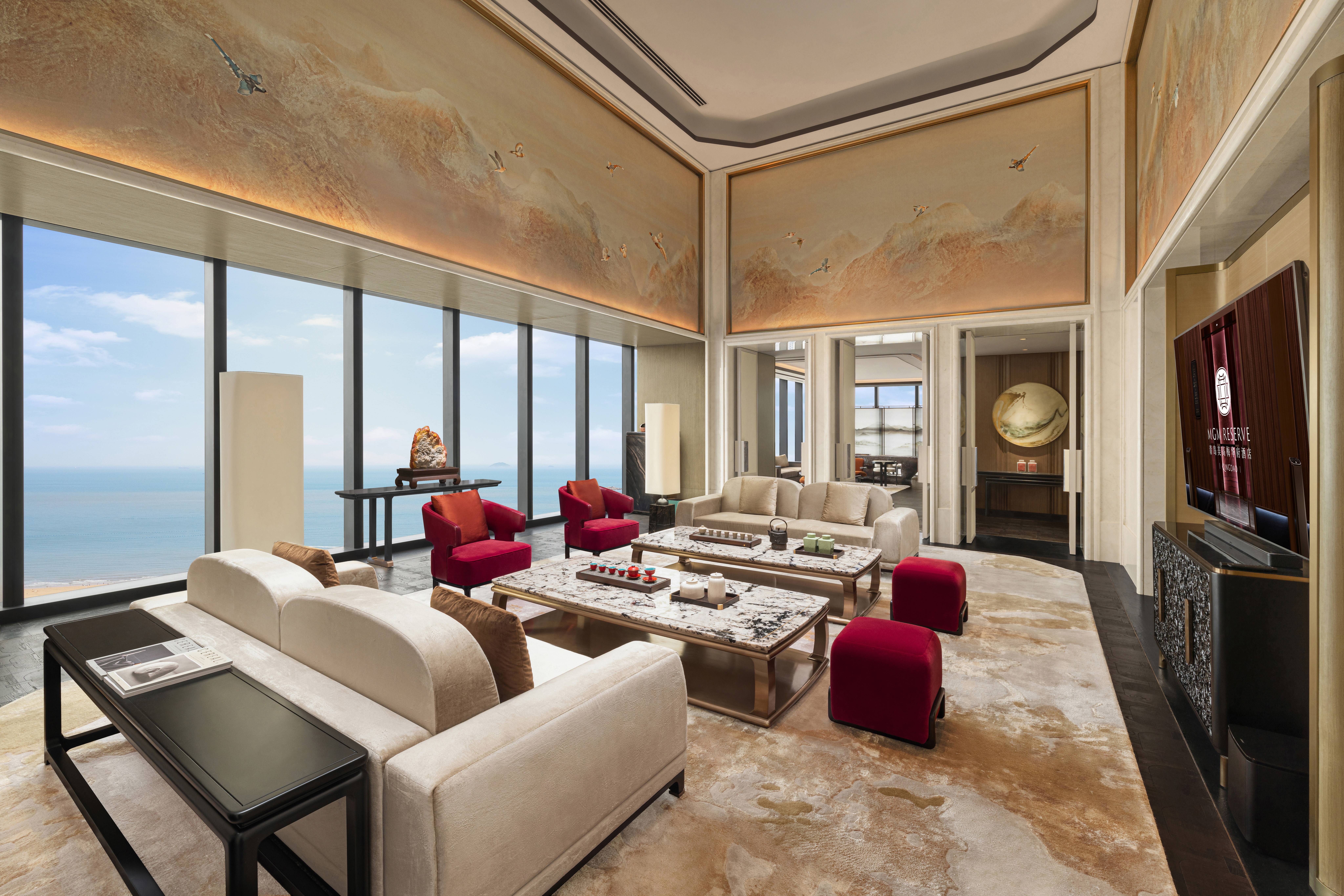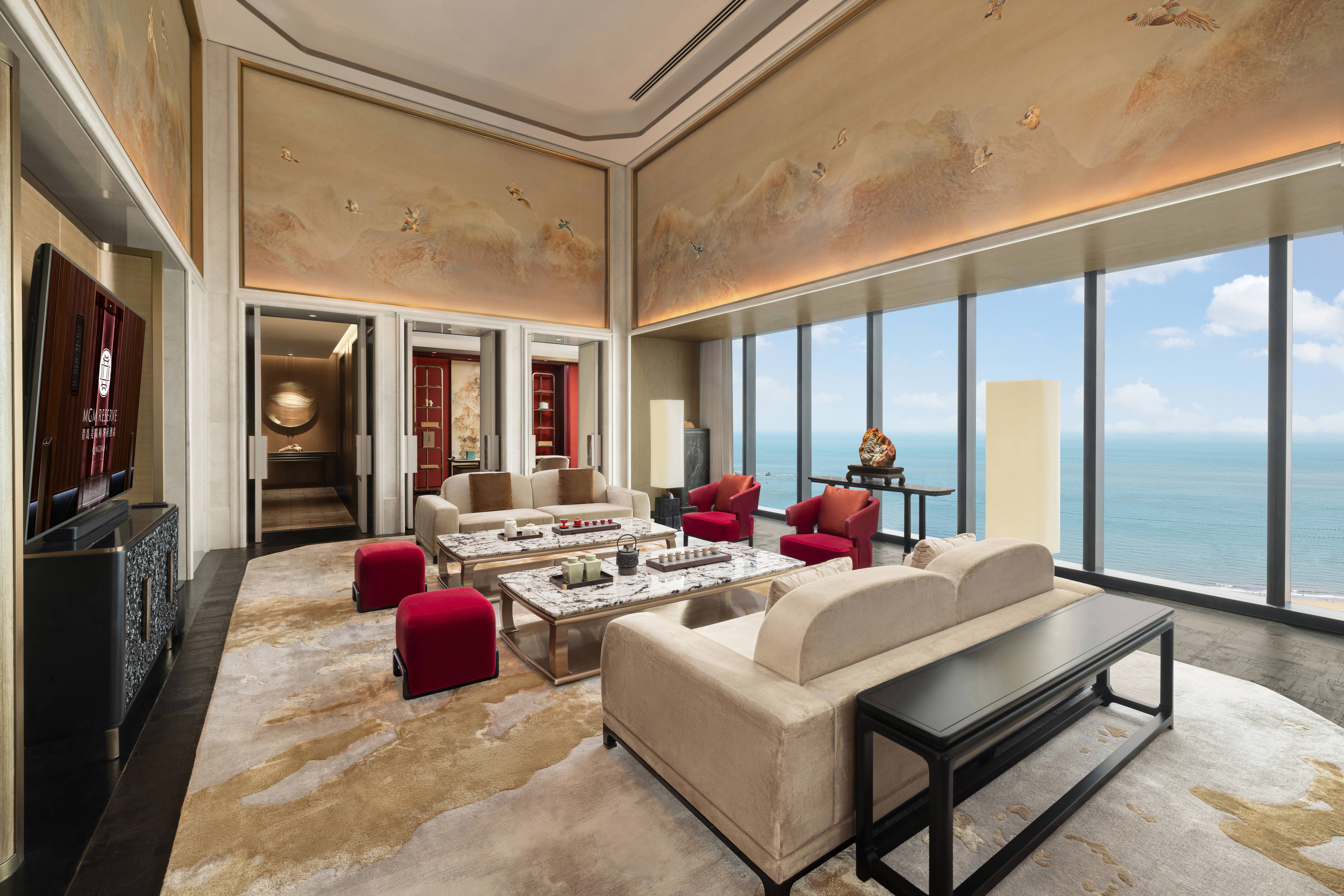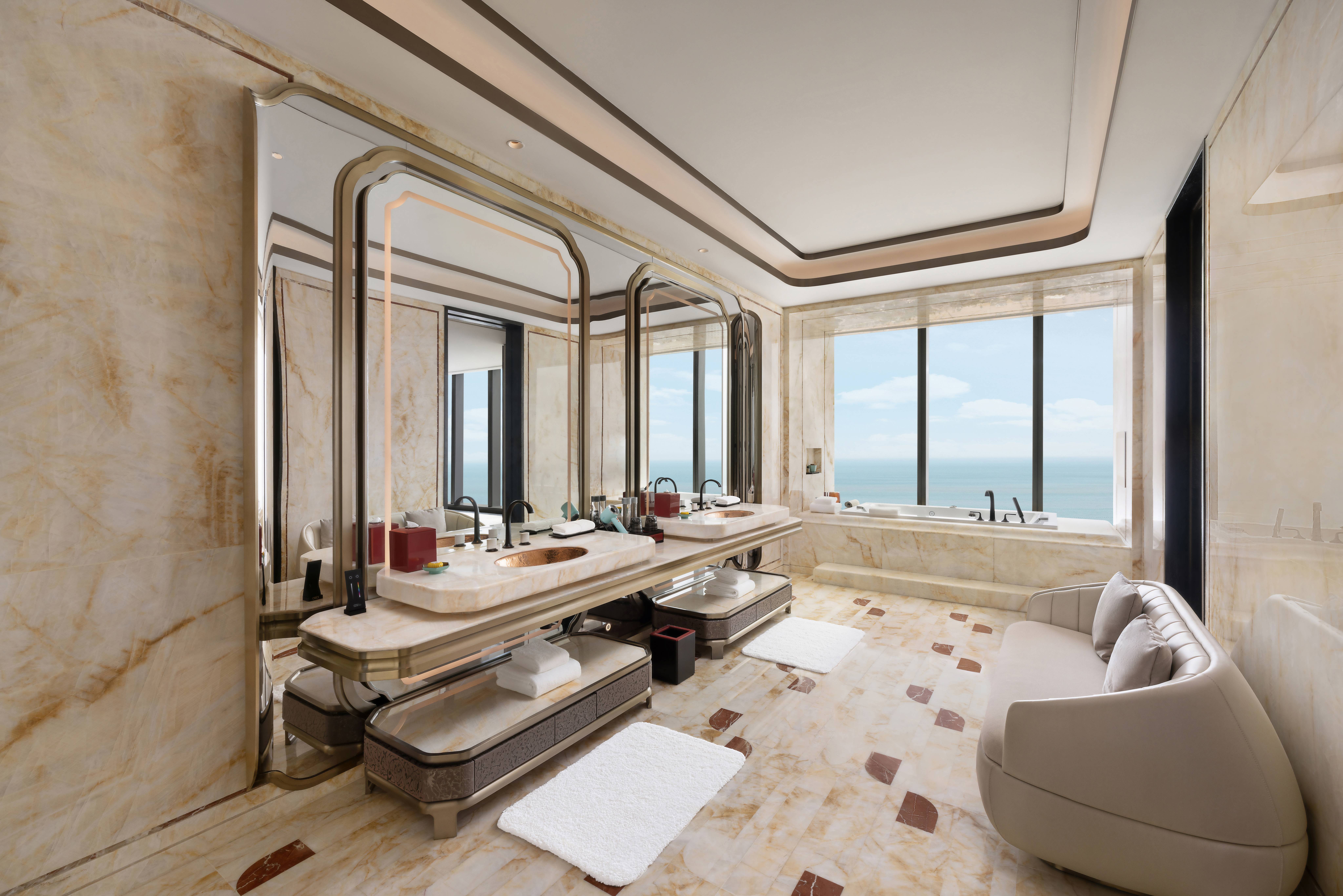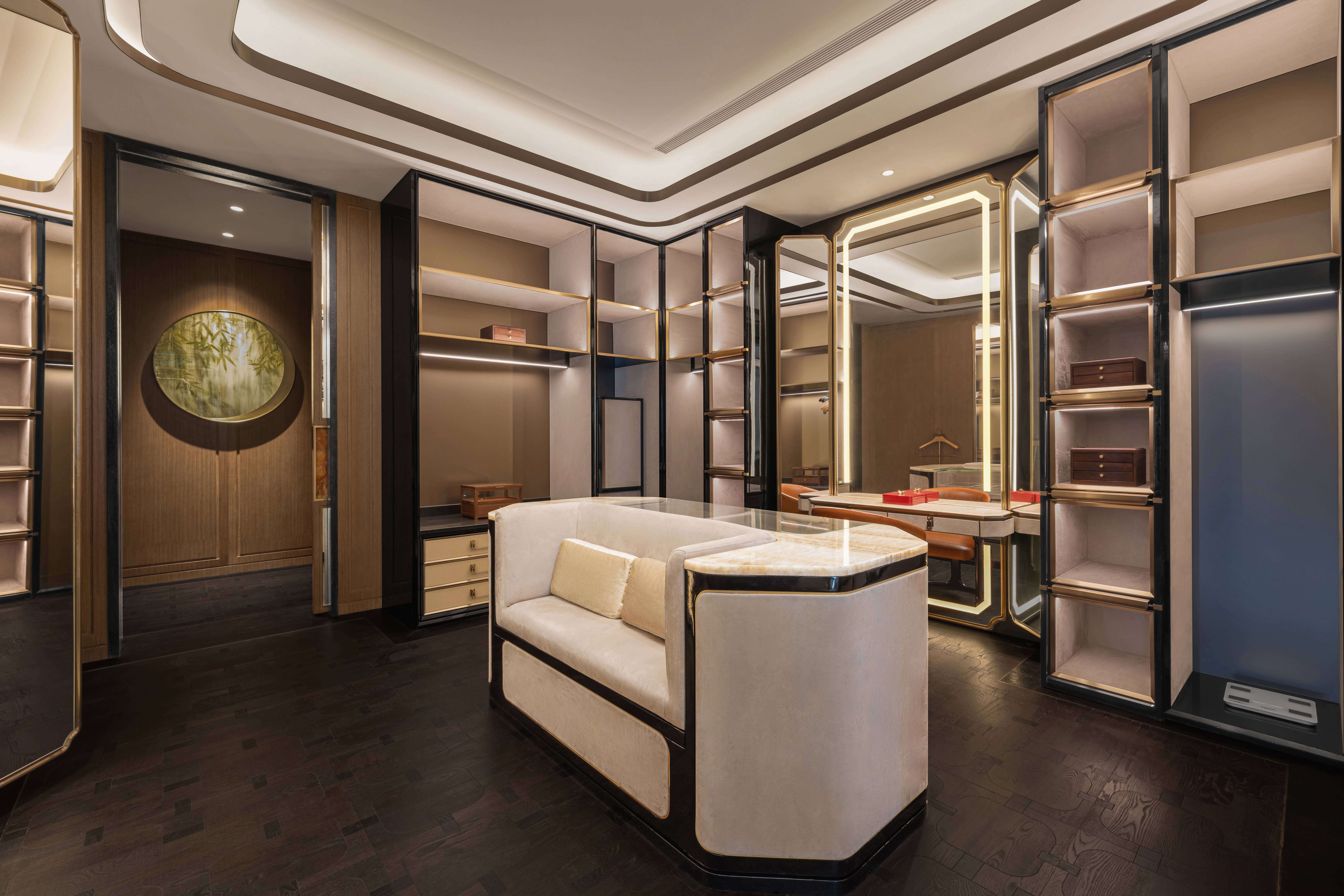 美高梅华府总统套房为470m²的奢阔府邸。套房拥有独立的会客室、书房、餐厅、卧室、衣帽间和卫生间。各种顶级设施一应俱全。墙面装饰的艺术画,书架上陈设着各色瓷器,与圆桌上方悬挂着的吊灯相得益彰,使整个房间洋溢着浓浓的艺术气息。客房的家具是为酒店专属设计,在提升舒适感的同时,提炼和升华细节,向中式美学致敬。享行政酒廊礼遇。