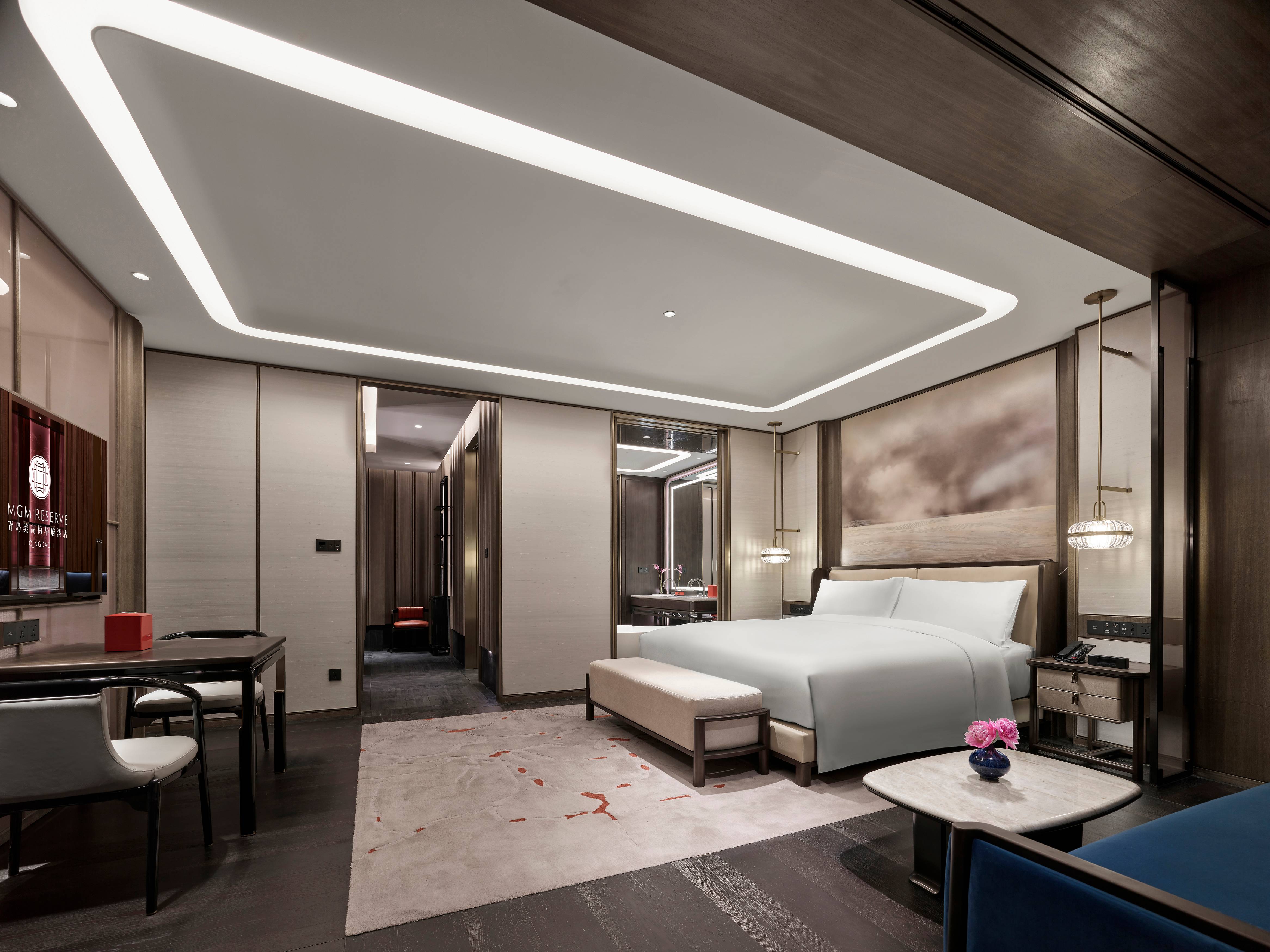 府邸尊贵海景客房55m²起,高楼层带来开阔的视野,宾客可在房间内欣赏青岛蜿蜒的海岸线。设计注重居住感的体验和细节的考究,宾客在阅尽繁华之后,可彻底享受身心的放松。客房的家具是为酒店专属设计,提升舒适感的同时向中式美学致敬。宽敞的步入式衣帽间,巧妙地将青铜材质点缀在设计细节中,尽显高雅与尊贵。墙面装饰的艺术画,书架上陈设着各色瓷器,与圆桌上方悬挂着的吊灯相得益彰,整个房间洋溢着浓浓的艺术气息。